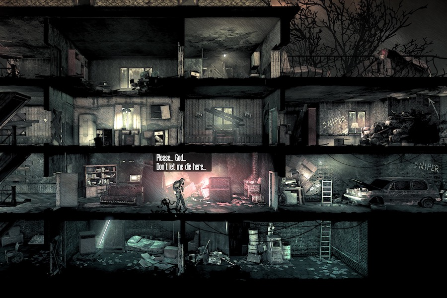 Была ещё одна игра, которую я могу отнести к искусству — This War of Mine. Игра про гражданскую войну в вымышленной стране, можно сказать, некая аллюзия на существующую действительность. Там задача в том, чтобы все твои персонажи, которые живут в полуразрушенном доме, выжили. Отправлялись на вылазки на городские руины, удовлетворяли базовые потребности.